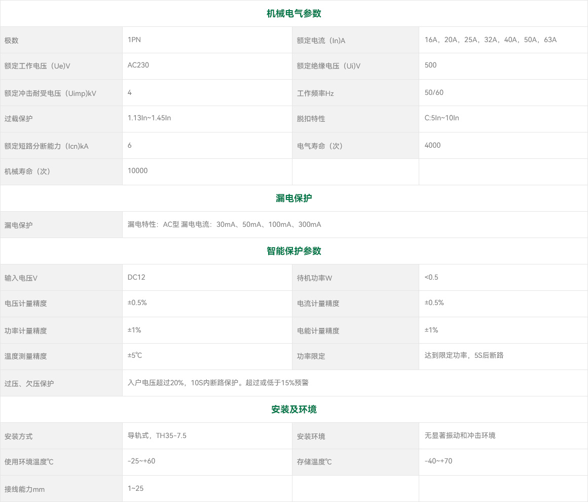 MLB2E-63/1断路器适用于交流50/60Hz,额定电压 230V,额定工作电流至63A的线路中,可本地手动分合,也可通过手机小程序及云平台远程控制,实时监测线路中电流、电压、功率、频率、温度、用电量等参数。对过压、欠压、过载发送预警,并实行自动断电保护,保障用电安全。